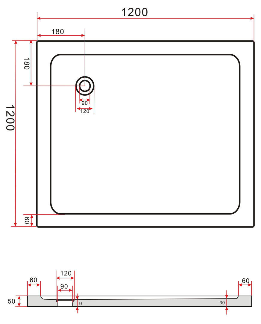 Acryl Douchebak Vierkant 120 x 120 x 5 cm – Laag Model – Versterkt met Glasvezel – Afvoergat Ø 90 mm