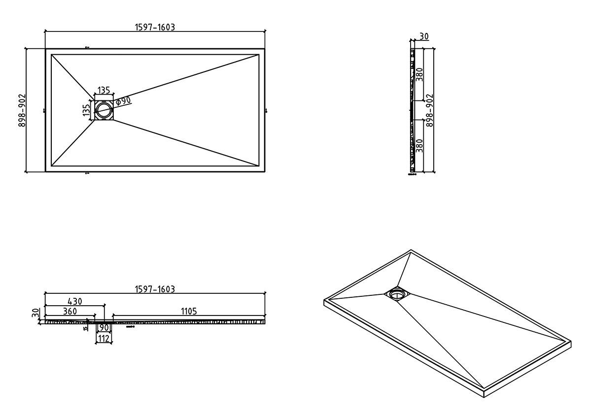 Kunststof Composiet Douchebak Mat Wit – Inclusief Sifon en Rooster – Antislip – Inkortbaar – 90x160x3 cm